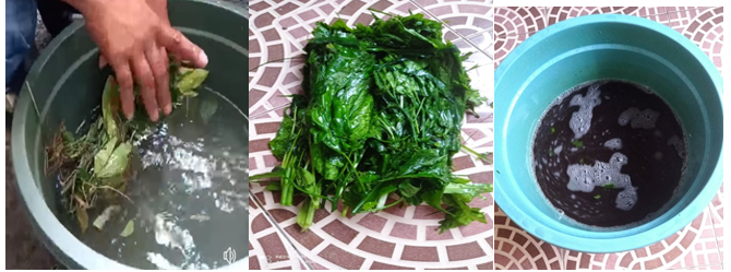 Gambar  4.  Peremasan daun di dalam ember dengan posisi daun terendam air saat peremasan,sekali diremas, sekali dilakukan pengadukan (Pertiwi, 2022)