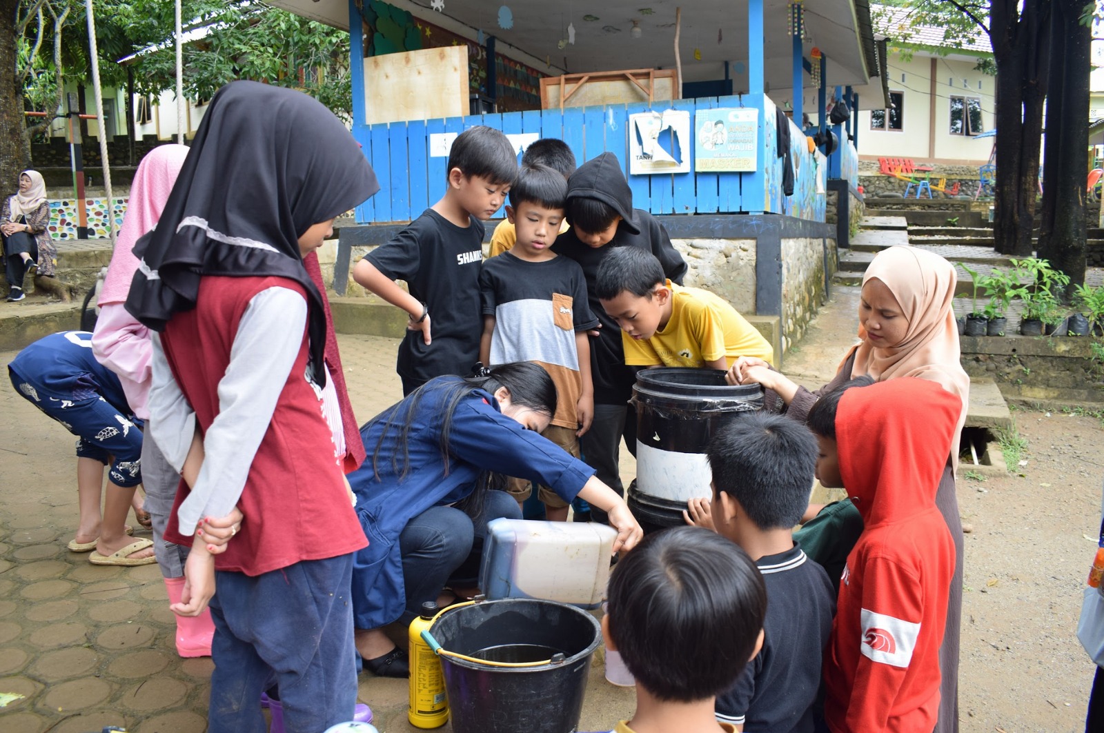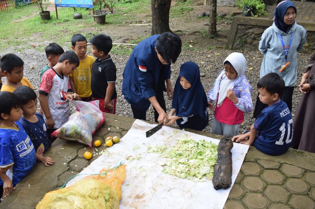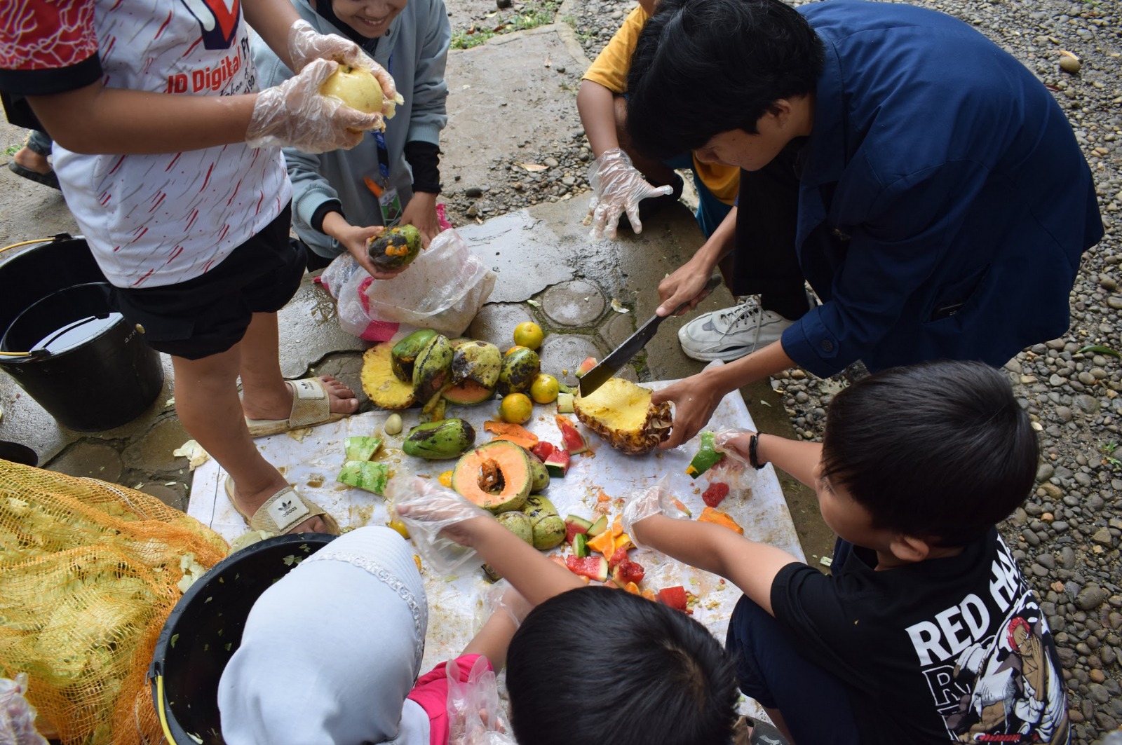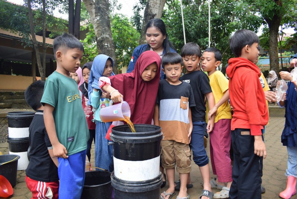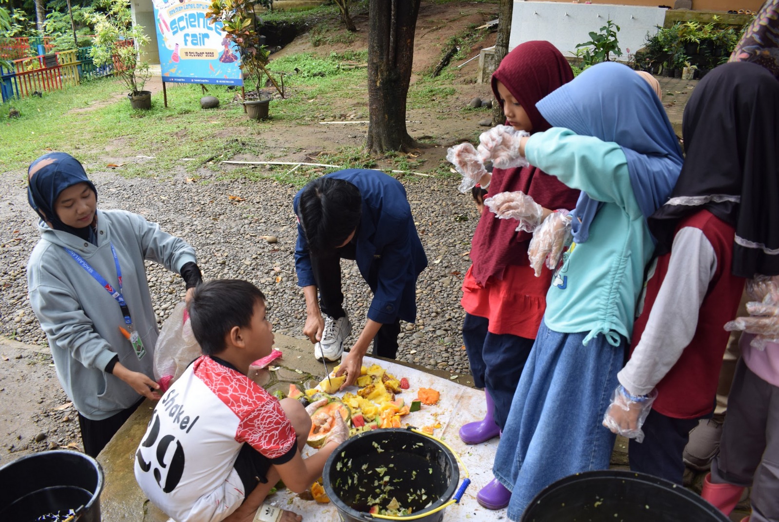 The second stage provided students with a direct experience in producing Liquid Organic Fertilizer (POC) from leftover fruit and vegetables. The activity took place outdoors in the school yard, enabling students to explore real organic materials and observe the fermentation process closely.