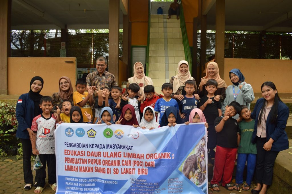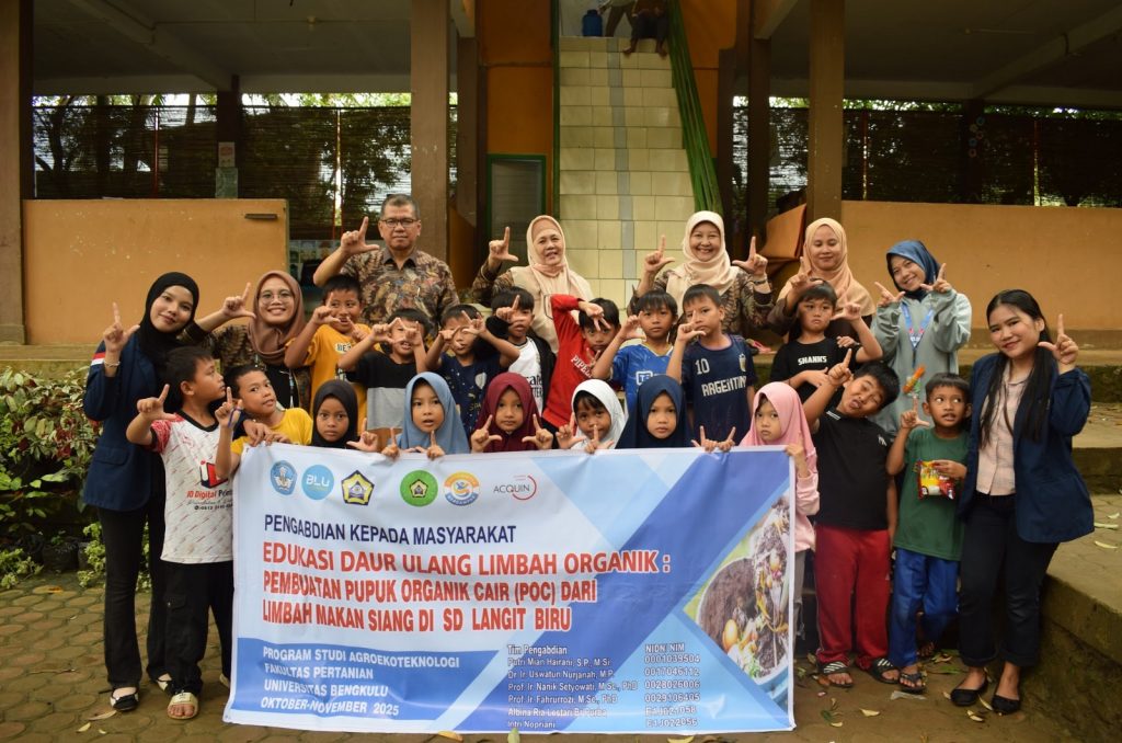 The Community Service Team (PkM) of the Agroecotechnology Study Program, Faculty of Agriculture, University of Bengkulu, successfully carried out a training program titled “Recycling Organic Waste: Producing Liquid Organic Fertilizer (POC) from Lunch Waste at SD Langit Biru.” This activity aims to build environmental awareness at an early age through hands-on learning and simple scientific practice.
