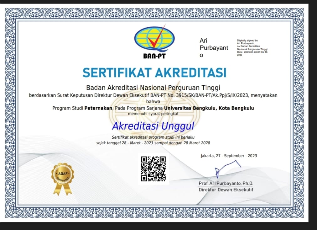 In a significant achievement, the Animal Husbandry Study Program, Faculty of Agriculture, University of Bengkulu has once again received an “Excellent” (Unggul) accreditation status from the National Accreditation Board for Higher Education (Badan Akreditasi Nasional untuk Perguruan Tinggi or BAN-PT). This prestigious accreditation has been formally announced through a decree issued by the Director of the Executive Board of BAN-PT, bearing the reference number 3915/SK/BAN-PT/Ak.Ppj/S/IX/2023.