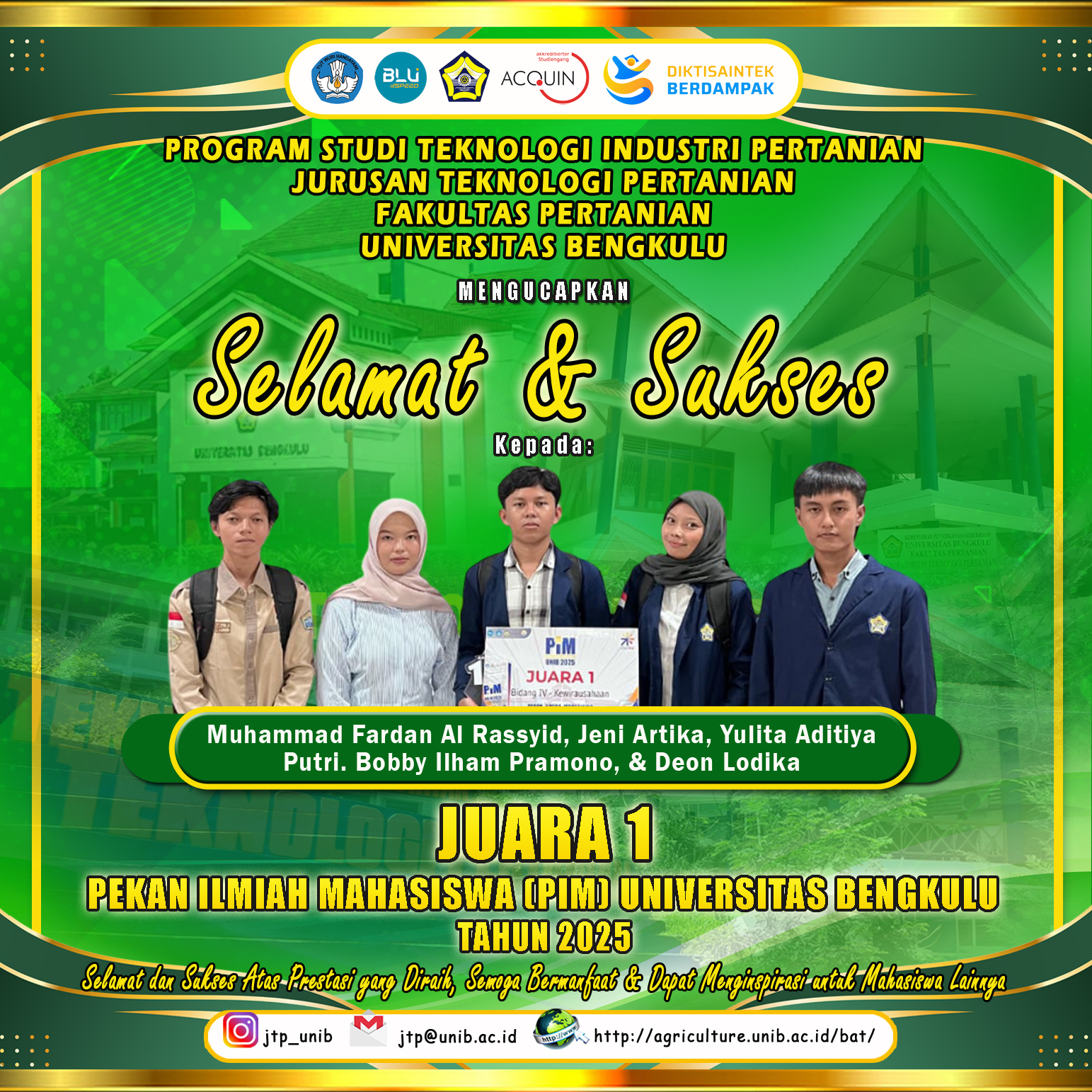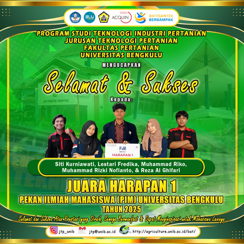 Students of the Agricultural Technology Study Program, Department of Agricultural Technology, Faculty of Agriculture, University of Bengkulu again made proud achievements at the 2025 Student Scientific Week (PIM) of the University of Bengkulu. In the field of Entrepreneurship, two teams from the Department of Agricultural Technology won 1st place and 1st place in the first place, showing the quality of student creativity and innovation in developing products based on local potential.