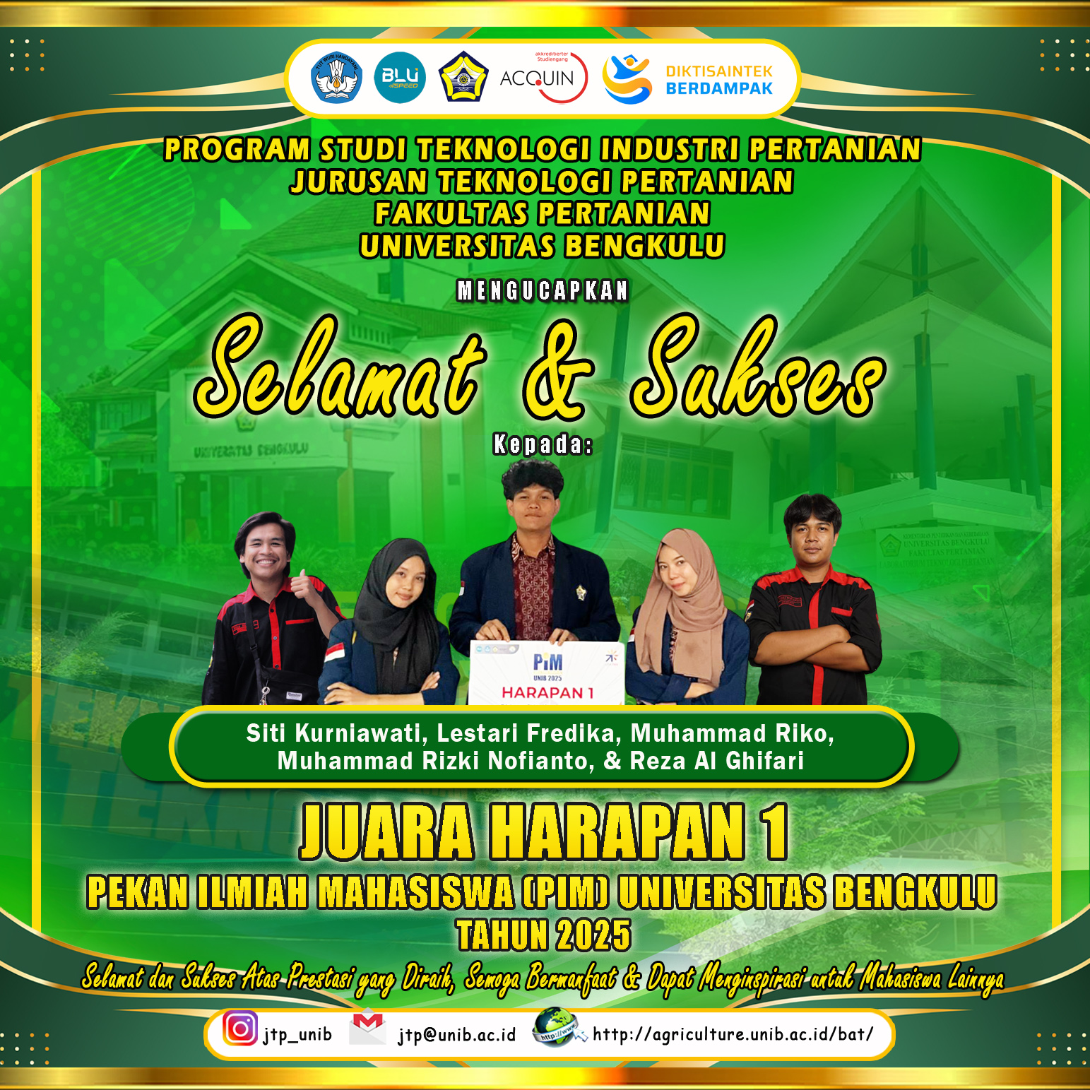 Students of the Department of Agricultural Technology Won 1st Place and 1st Place in the 2025 University of Bengkulu Student Scientific Week