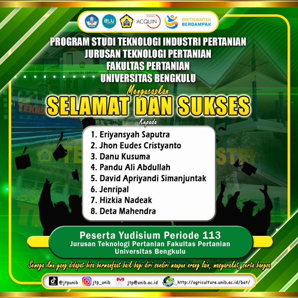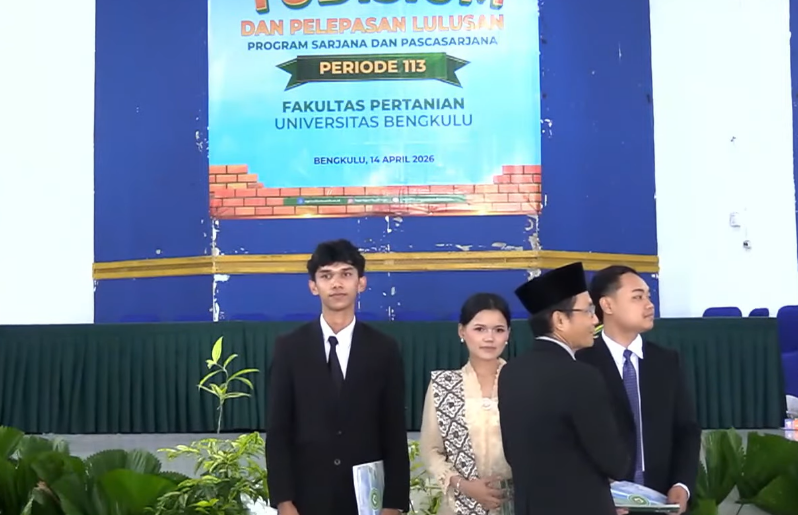 Yudisium of the Faculty of Agriculture, University of Bengkulu Period 113 was held at Building C, University of Bengkulu on Tuesday, April 14, 2026. The Yudisium of the Faculty of Agriculture Period 113 graduated 102 people, of which the number of participants from the Agricultural Industrial Technology Study Program was 8 people. The average GPA of graduates of the Agricultural Industrial Technology Study Program is 3.11. On the same occasion, the announcement of the winners of the Faculty of Agriculture Thesis Competition was also held in the context of the 113th Yudisium. One of the participants of the Yudisium from the Agricultural Industrial Technology Study Program, Eriyansyah Saputra, won 3rd place in the event.