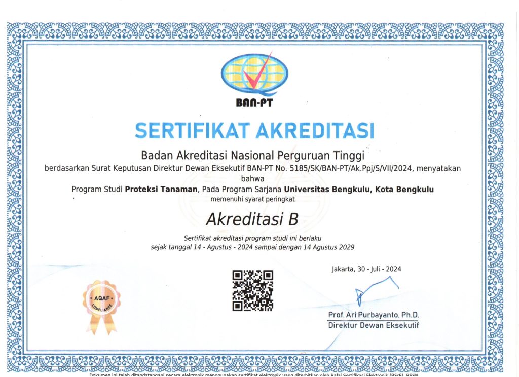 Badan Akreditasi Nasional Perguruan Tinggi berdasarkan Keputusan BAN-PT No. 5185/SK/BAN-PT/Akred/S/VII/2024, menyatakan bahwa Program Studi Proteksi Tanaman, Pada Program Sarjana Universitas Bengkulu, Kota Bengkulu Terakreditasi dengan peringkat Terakreditasi B