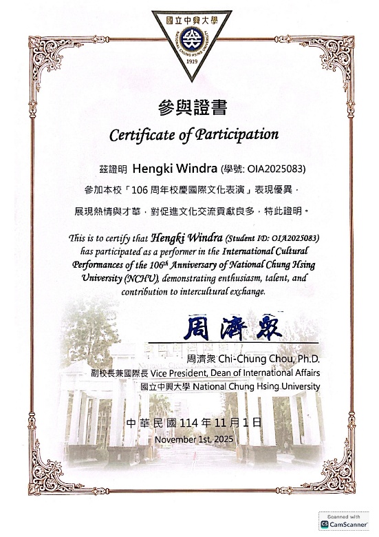 Bengkulu, November 2025 – Universitas Bengkulu kembali mencatatkan prestasi membanggakan di kancah internasional. Hengki Windra, mahasiswa Program Studi Proteksi Tanaman, Fakultas Pertanian Universitas Bengkulu, yang saat ini tengah menjalani program Awardee Research Assistantship Scholarship di National Chung Hsing University (NCHU), Taiwan, turut tampil mewakili Indonesia dalam ajang bergengsi “NCHU Anniversary 106 – Global Talent (International Cultural Performances)”.