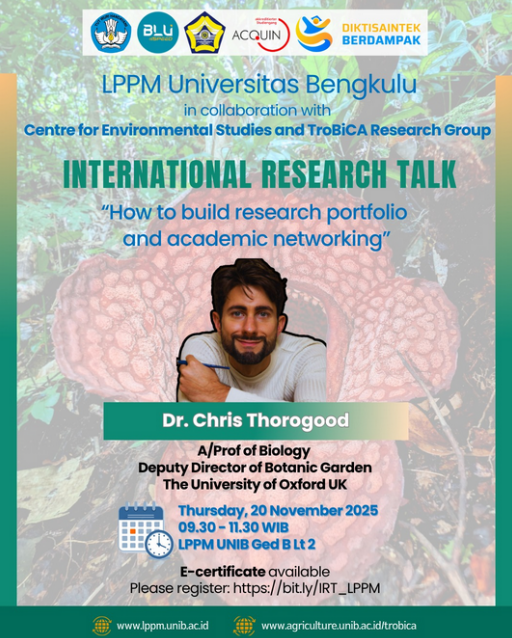 The second guest lecture, also called as International Research Talk was offered by LPPM Universitas Bengkulu, held on November 20th, 2025, presented a topic of “How to build research portfolio and academic networking”. The speaker was Dr. Chris Thorogood, Assistant Professor of Biology and Deputy Director Botanic Garden, University of Oxford, United Kingdom. This interesting topic was an offline event conducted at Ruang Pertemuan LPPM UNIB, Gedung B 2nd floor. Another online guest lecture was offered by Program Studi Doktor Ilmu Pertanian, Fakultas Pertanian Universitas Padjadjaran, presented Webinar Seri 29 themed “Circular Agriculture System: Regenerasi Kesehatan Tanah, Praktik Ramah Lingkungan, dan Mitigasi Emisi Pertanian”. This seminar was conducted in November 24th, 2025, featuring a Keynote Speaker of Dr. Ania Citraresmini, S.P., M.P., Lecturer in Departemen Ilmu Tanah dan Sumber Daya Lahan, Fakultas Pertanian, Universitas Padjadjaran.