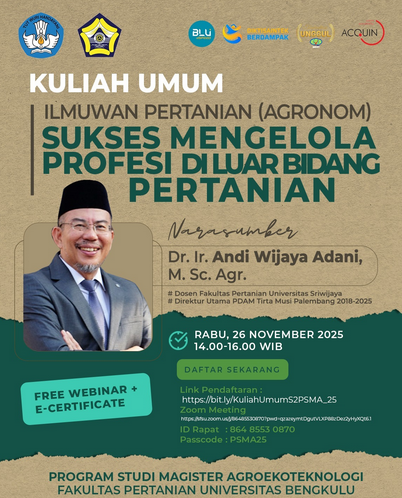 Finally, during the month of November, PSDIP students had wonderful chance to enjoy an online Public Lecture, organized Master of Agroecotechnology Study Program, Faculty of Agriculture University of Bengkulu. This seminar, held on November 26th, 2025, featured Dr. Ir. Andi Wijaya Adani, M.Sc.Agr., Lecturer of Faculty of Agriculture Universitas Sriwijaya & as former Director of PDAM Tirta Musi Palembang 2018-2025. His presentation topic focused on “Ilmuwan Pertanian (Agronom) Sukses Mengelola Profesi di Luar Bidang Pertanian”.